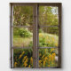 Yellow flowers, green grass and trees. Beautiful nature outside an old window. Photography.