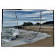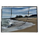 Sitting on the beach in the evening watching the approaching rain clouds move across the sky. The sea tide is coming in and the small local town of Tywyn shows in the distance. Gwynedd Wales UK.