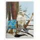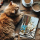Norwegian Forest cat sitting by a tree with a blue dragon sit-in a a bottle helmet. Snow all around them, sword and viking axe with them.