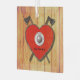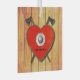 Crossed Viking axes behind a red, heart shaped shield. The shield hangs on a bare wood plank wall. Add your own text on the shield.