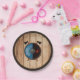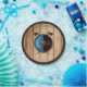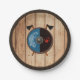 A Viking shield and crossed battle axes superimposed on a wooden plank wall background image. The shield is black on the left side with a red right hand print. The other side of the shield is blue with a white eagle in Celtic-Norse style. Customise by adding your own text. You may also change the colours of the border rings or remove them.