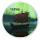 A slightly stylised image of a Viking longship sailing at night under the Northern Lights there a couple of icebergs; most of the crew is asleep. Text reading "VIKINGAR" (Vikings) also appears.