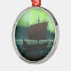 A slightly stylised image of a Viking longship sailing at night under the Northern Lights there a couple of icebergs; most of the crew is asleep.