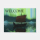 A slightly stylised image of a Viking longship sailing at night under the Northern Lights, along with text reading, "WELCOME." There a few icebergs; most of the crew is asleep.