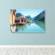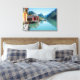 Canvas print of a landscape with boathouses in the village of Fjærland (Mundal) and mountains with reflection in the water of the fjord Fjærlandsfjord, Sogn og Fjordane in Norway.