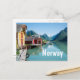 Postcard of a landscape with boathouses in the village of Fjærland (Mundal) and mountains with reflection in the water of the fjord Fjærlandsfjord, Sogn og Fjordane in Norway with the text: 'Norway'.