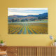 The image showcases a vineyard landscape with rows of grapevines in the foreground, their leaves displaying autumnal yellow and gold hues. Beyond the vineyard, a green field stretches towards rolling hills dotted with trees. The hills transition into a mountain range in the background, all under a sky with soft, pastel colours of blue, pink, and orange of the setting sun.