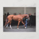 VINO ROSSO, a stunning chestnut colt with a white blaze, is shown here in the Aqueduct paddock shinning like a copper penny before the start of the Wood Memorial stakes. Wearing a number nine light blue vest and saddlecloth, his handler parades Vino Rosso