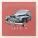 Stylish coaster design for vintage car lovers features illustration of a black 1940s Buick sedan with customisable text on warm terra cotta background