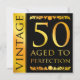 Celebrate a 50th birthday in style with this elegant aqua orange, yellow and black birthday party invite that says 'vintage, aged to perfection'.