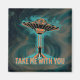 Playful Slogan: In front of the saucer, a charming figure waves enthusiastically with the phrase “Take me with you” emblazoned above, inviting a sense of adventure and wonder.