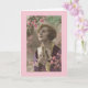 A vintage tinted photograph of a young woman sitting in a garden while reading a book. From the book's cover, it looks to be a romance novel. She clutches it over her heart and sighs as she dreams of having a romance like the lovers in the book. The message inside the card is: "I want a fairytale ending."