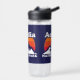 The bottle looks even better in real life. The ice cubes I put in lasts all day! I have my bottle with me all the time. It's summer and having something cold to drink feels amazing. With this bottle I always have something super cold. I have only tried the hot drink once and it lasted a long time as well. The color blue is a navy blue and the white printed on it is vibrant. It printed perfectly. I love my personalized smile water bottle.