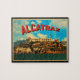 This modern vintage travel graphic features the famous prison on Alacatraz Island off San Francisco, California. A gorgeous blue sky over the cliffs and bay make this a brilliantly-hued watery scene.