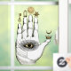 Alchemy themed window cling features vintage Hand of Mysteries illustration on dark distressed harlequin background. The alchemical symbol of apotheosis, the transformation of man into god, is traditionally represented by an image of a hand with other symbols, including skulls, crowns, stars, fish, keys, lanterns, astrological symbols and the all-seeing eye.