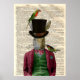 Vintage dictionary page with print of a vintage rabbit wearing a colourful suit. The vintage animal illustration also has colourful vintage birds. The background is an original antique dictionary page.