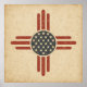 A rustic, vintage-style fusion of the iconic Zia sun symbol and the American flag. Faded colors, worn texture, and a Southwest aesthetic.