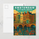 Capture the vibrant and cozy spirit of the Dutch capital with this beautiful Amsterdam, Netherlands Travel Card. This vintage-style illustration features a row of iconic, multi-colored gabled houses reflecting in the serene waters of a city canal.