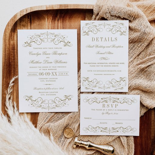 Decorative swirls and flourishes frame this elegant vintage inspired wedding save the date card design. White and antique gold colour scheme.