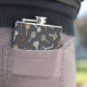 This flask features hand-illustrated vintage and antique keys for safes and locks on a dark blue background.