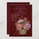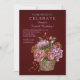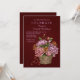 A feminine floral design featuring pink and rust flowers and berries arranged in a wicker basket against a deep burgundy background.