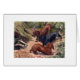 Vintage artwork depicting three Dachshund dogs in a wooded area as they approach an animal's den dug near the base of a tree. Just as they get close, a nasty badger pops out of the den snarling and nipping at the dogs. One dog turns away in fear, but the other two face down the badger, snarling and barking in return. This card is blank inside for your own message.