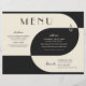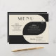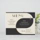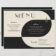 These vintage art deco style 11" x 8.5" wedding dinner paper sheet menus black and white lettering with geometric design in black and cream on a black background. The menu has placeholders for 2 appetizers, 2 entrees, and 2 desserts and the wedding couple initials.