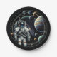 Space themed birthday party plates. Surreal AI art depicting an astronaut floating in outer space with planets and moons. Hyper realistic comic book style astronaut in space.