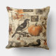This throw pillow features a vintage-inspired autumn collage, blending rustic nature motifs with antique ephemera. The composition includes pumpkins, perched birds, autumn leaves, berries, and faded postcards, all layered over textured, handwritten backgrounds. Rendered in warm earthy tones of orange, cream, and sepia, the pattern evokes a nostalgic farmhouse charm. Perfect for fall décor, Thanksgiving, and rustic vintage themes, this design captures the essence of cosy autumn days.