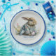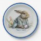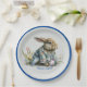 Remove or replace the text on these adorable vintage watercolor style Easter themed paper plates. Designed with a baby bunny rabbit wearing a cutely detailed floral print coat with two Easter eggs and spring flower accents on shades of blue. Look for matching cups, napkins and other items in this same design collection.
