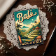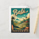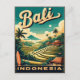• This retro-style travel postcard captures the beauty of Bali, Indonesia, featuring lush green rice terraces, tropical palm trees, traditional Balinese architecture, and a majestic volcano under a serene sky.