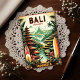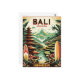 • This retro-style travel postcard captures the beauty of Bali, Indonesia, featuring lush green rice terraces, tropical palm trees, traditional Balinese architecture, and a majestic volcano under a serene sky.