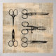 A vintage barbershop barbers shears art design featuring old fashioned salon and haircutting scissors with a vintage newspaper style background.