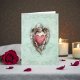 A unique vintage-inspired greeting card featuring an adorable cherub presenting a red weathered heart. Surrounded by baroque scrollwork and frame over an aqua grunge background, this card is blank inside for your personal message. This versatile card is a good choice for many occasions: Valentine's Day, weddings, engagements, and even use as a sympathy card. You'll want to keep several on hand!
