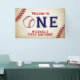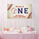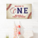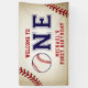 Vintage Baseball First Birthday, welcome banner, can also be used for a photo backdrop. Take me out to the ballgame! This napkin is created with a vintage background texture, baseball stitch accents with "One" in the centre, the "O" is replaced with a baseball. Additional party supplies can be found in our shop at MetroEvents on Zazzle.