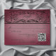 Elevate your gothic wedding with a Victorian-inspired response card with a QR code that exudes timeless elegance and mystery. Designed to resemble an antique book binding, this stunning design features intricate a black lacey filigree on a vintage, distressed burgundy background, evoking the charm of a bygone era and adding a touch of dark romance, perfect for setting the tone for your unique celebration. Let your love story unfold with a design as unforgettable as your day. Created by Simply Farmhouse Press.