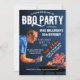 Fire up the grill! Birthday BBQ Party Invitations with retro man grilling on dark blue chalkboard background. Fiery and fun!