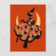 A lovely illustration of a partially silhouetted design of a young witch woman. She is sitting on a crescent moon, wearing a pointed hat, and an orange dress, with black cat designs that are patterned onto it. She is also holding a broomstick. Great for those who love witches, moons, and vintage, Halloween art.