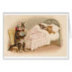 A vintage illustration of two kittens snuggled in a bed on the verge of falling asleep as the parent cat sits in a chair reading them a bedtime story. It could be either the mother or the father cat who is taking part in this nightly bedtime tradition. This card is blank inside for your own message.