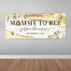 Bee hive baby shower banner featuring yellow and gold glitter agate crystal edges, a honeycomb background, honey drips, white watercolor florals, bees, and a elegant mummy to bee template that is easy to personalise.