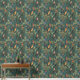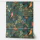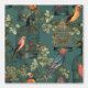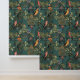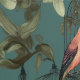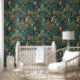 Elegant wallpaper featuring vintage illustrations of bird cages, tropical red, orange and yellow birds and greenery.