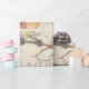 Vintage Birds sitting on branches with a background of music notes and ornate filigree elements. One bird is black and white and other two are orange and brown.