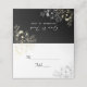 Vintage, elegant, black wedding place card, with silver and gold flowers and modern calligraphy script.