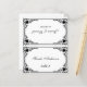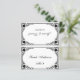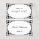 A vintage black and white wedding place card with the guest name and the table number printed on its front and the bride and groom names and the wedding date printed on the other side (that is the other half, before folding it). It has an antique ornate frame with baroque decorations. All text is black, written in elegant calligraphy. The background is white.