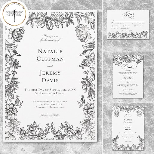 Bring timeless elegance to your special day with this vintage floral wedding invitation, featuring a black and white tapestry-style illustration of flowers and leaves framing a crisp white centre. The intricate botanical border adds a classic, heirloom feel, perfect for traditional, garden, or vintage-inspired weddings. Created by Simply Farmhouse Press. For custom pieces or to request a product not in our store, please email simplyfarmhousepress@gmail.com.