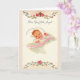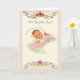A vintage greeting card image features a newborn baby awake and smiling while lying in a crib or bassinet. Garlands of pink roses decorate the top and bottom of the card and a small cross is centred in the rose garland over the baby's head. The front of the card says "Bless Your Little Angel" and the message inside the card is "A tiny angel sent from above has come to fill your hearts with love. Congratulations!"