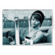 3D digital render of a beautiful young vintage woman sitting in a car on a background of a summer city, blue coloration