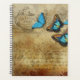 A unique and beautiful vintage-inspired design with a brown/tan background and four bright blue butterflies. There are wonderful elements including a teapot, scrollwork, and writing