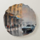 Vintage Blue Car in Foggy Cityscape Round Cushion