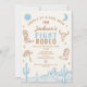 Sweet brown and blue boy's first rodeo birthday invitation featuring a blue desert landscape, cowboy boots and hat, skull, moon and sun. This western saddle up and ride over first birthday invitation for a boy is ideal for a southwest country or wild west themed first birthday party.
